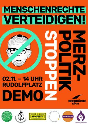 Unter dem Motto "Menschenrechte verteidigen - Merz-Politik stoppen" rufen wir als Kölner Initiativen dazu auf, für eine solidarische Gesellschaft auf die Straße zu gehen, in der Migration eine Selbstverständlichkeit ist und das Asylrecht gestärkt wird, in der Sozialabbau keinen Platz hat, in der wir Verantwortung für die Klimakrise übernehmen und unsere Regierung sich für internationale Lösungen einsetzt.