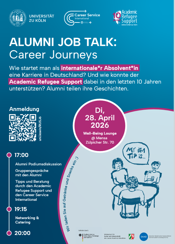 Anlässlich seines 10-jährigen Jubiläums lädt der Academic Refugee Support der Universität zu Köln zu einem Alumni Job Talk ein. Ehemalige Teilnehmende geben Einblicke in ihren Berufseinstieg in Deutschland und teilen wertvolle Tipps aus erster Hand.