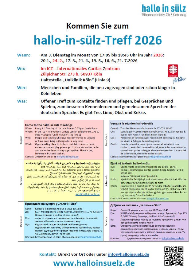 An jedem 3. Dienstag im Monat findet von 17:00 -18:30 Uhr im ICZ (Internationales Caritas Zentrum) der "hallo in Sülz"-Treff statt, ein Café für die Begegnung von Menschen aus dem Veedel, die schon lange hier wohnen oder erst vor kurzem hierher geflüchtet sind.