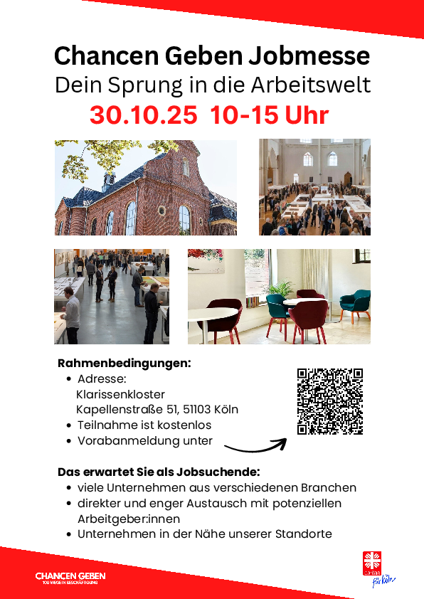 Unter dem Motto „Dein Sprung in die Arbeitswelt“ bietet das Caritas Jugendbüro mit dem Projekt “Chancen Geben” interessierten arbeitsuchenden Personen die Chance auf ehrliche Gespräche und neue Perspektiven auf dem Arbeitsmarkt. Ziel ist es Arbeitssuchende und Unternehmen zusammenzubringen – direkt, persönlich und ohne Umwege. Viele Unternehmen aus verschiedenen Branchen sind vor Ort, was einen direkten und engen Austausch mit potentiellen Arbeitgeber:innen ermöglicht.